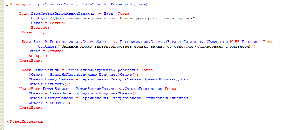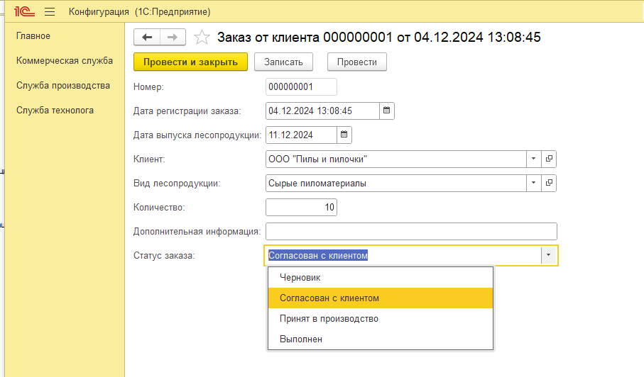 - Реализовать проверку заполнения реквизитов при проведении документа Заказ на лесопродукцию со статусом Согласован клиентом.