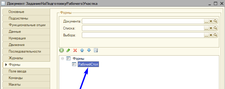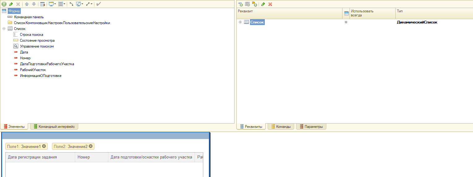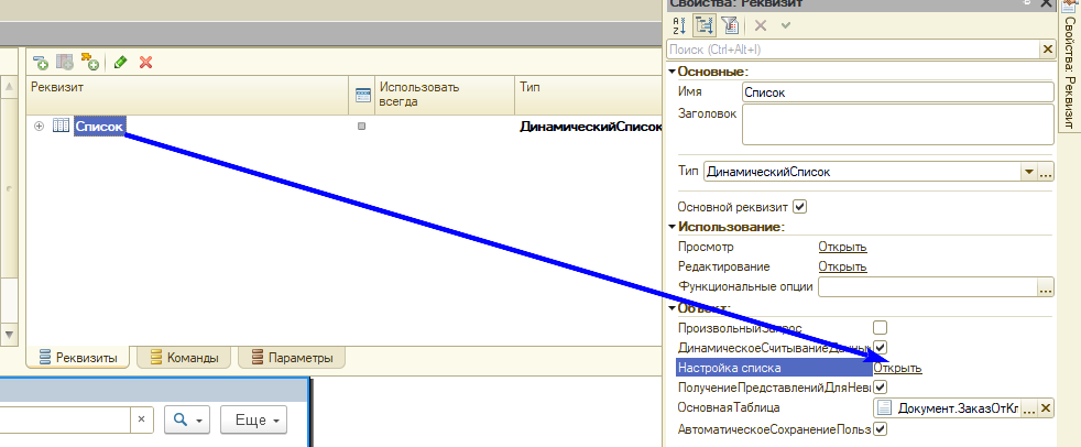 Рис. 1.3.На открывшейся форме находим свойство реквизита Список — Настройка списка: рис. 1.4.