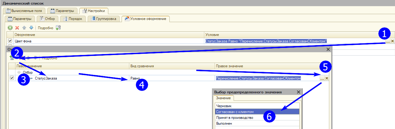 Рис. 1.5.В качестве условия оформления указываем, что статус заказа должен быть равен Согласован с клиентом, рис. 1.6.