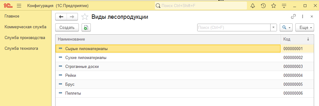| Виды лесопродукции доступны сотрудникам коммерческой службы, сотрудникам службы производства и службы технолога | 1 |