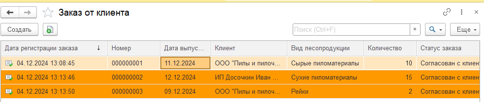 Ввести три заказа со статусом Согласован клиентом с видами лесопродукции: