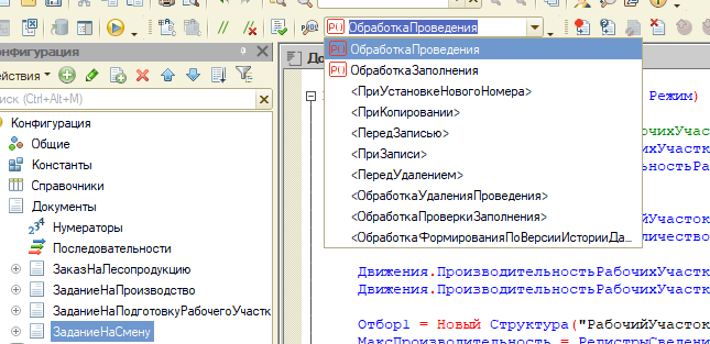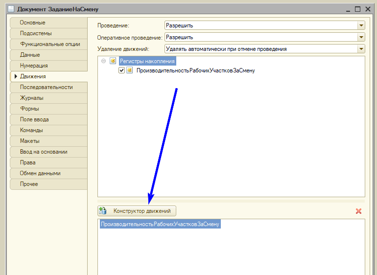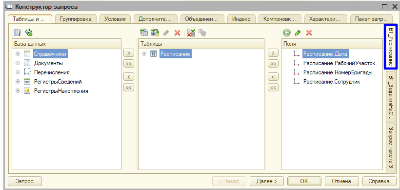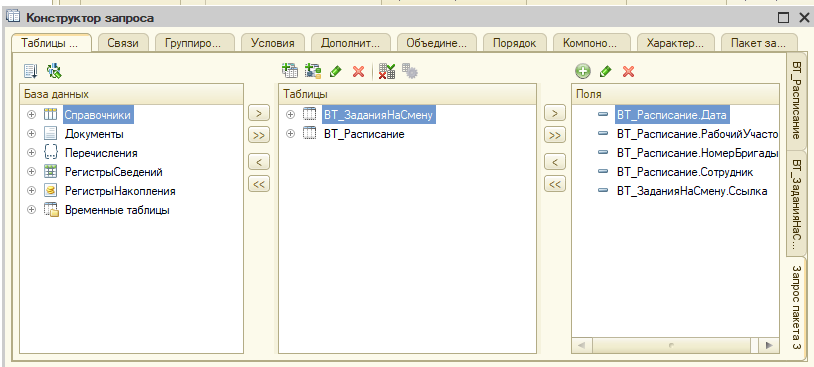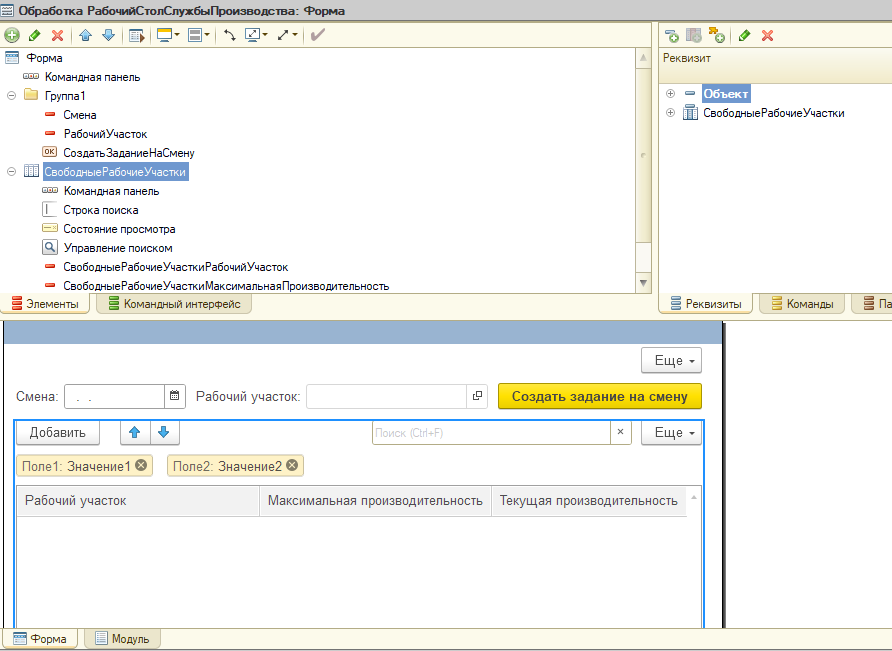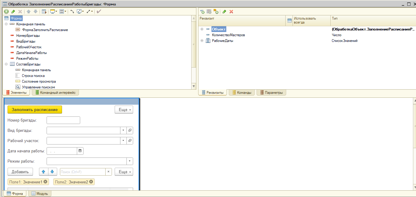 Создать объект Расписание работы бригады с реквизитами согласно заданию. На рис. 1.34 реализация этого с помощью регистра сведений (можно было использовать документ).