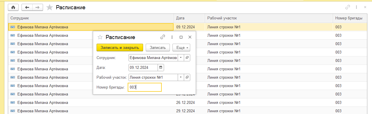 | Создать расписание бригады по сушке с вариантом работы 1/1 | 3 |