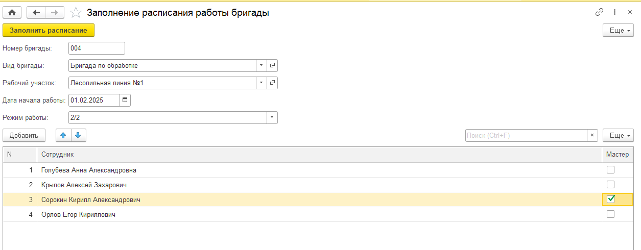 | Создать расписание бригады по распиловке с вариантом работы 1/1 | 3 |
