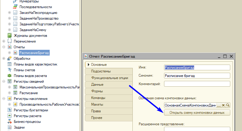 Создать отчет Расписание работы бригад Лесозавода. Вариант реализации отчета может быть любым, в соответствии со знаниями и навыками участника — можно использовать стандартный объект Отчет и Схему компоновки данных. Можно использовать объект Обработка с выводом информации в Макет — вариантов может быть много. Отчет был создан через специальный объект, который так и называется — Отчеты, рис. 1.39.