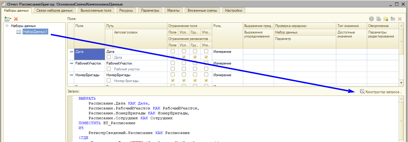 Рис. 1.39.В открывшемся окне схемы компоновки данных создадим новый набор данных при помощи запроса. Сам запрос создадим при помощи конструктора, рис. 1.40.