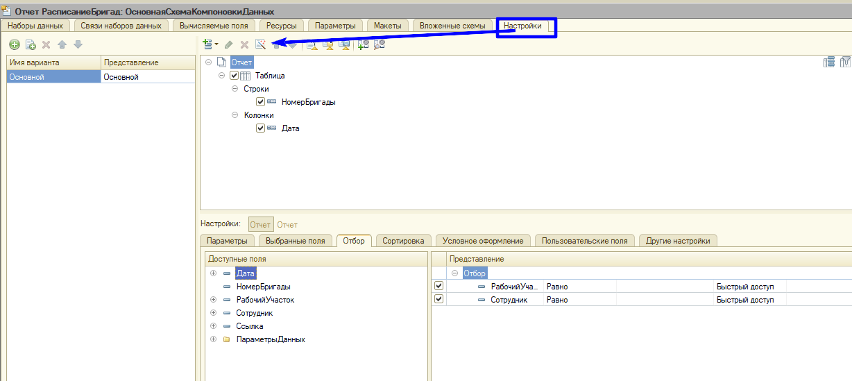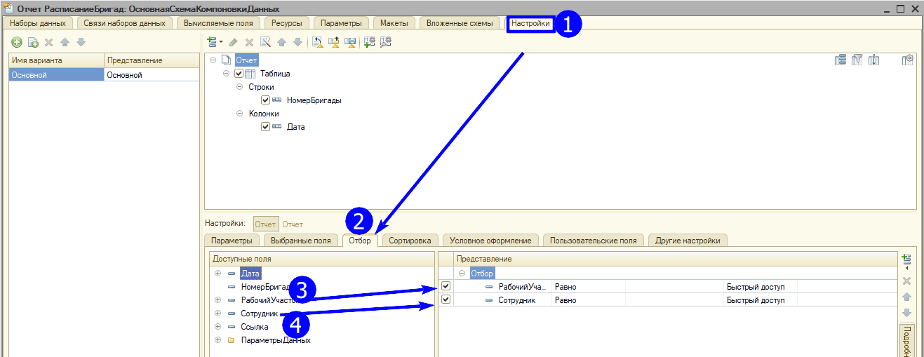 В отчет добавить отбор по цеху и сотруднику, делается также на закладке Настройки схемы компоновки данных, рис. 1.48.