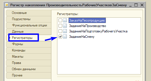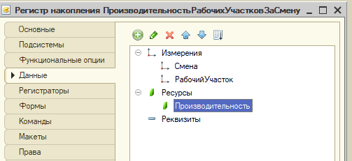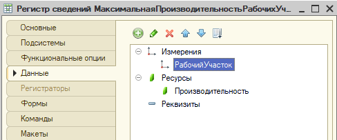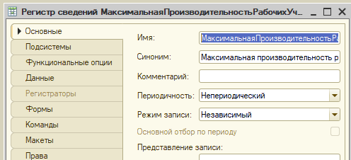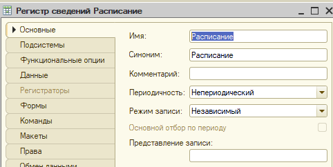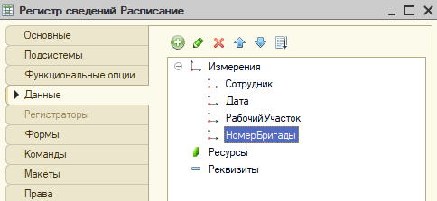 Создать объект Расписание работы бригады с реквизитами согласно заданию. На рис. 1.34 реализация этого с помощью регистра сведений (можно было использовать документ).