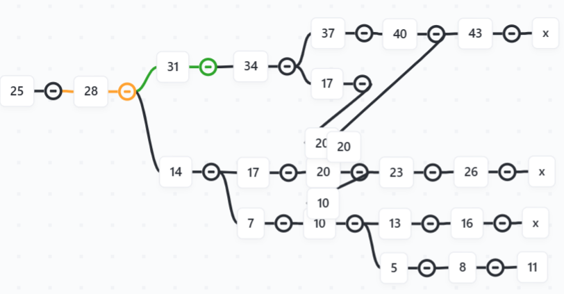 Построим диаграмму возможных значений плана «обратным ходом», то есть от числа 25 (предполагая, что варианты получить такое значение вообще есть) переходя к другим, предшествующим, значениям при помощи операций \(+3\) и \(/2\), предполагая деление на 2 целочисленным и возможным только в той ситуации, когда рассматриваемое значение делится на 2 без остатка. В частности, это означает, что если рассматриваемое число нечетное, то «после него» (при продвижении обратным ходом) будет следовать только одно значение (полученное как \(+3\)). Если же рассматриваемое число четное, то «после него» следуют два значения.