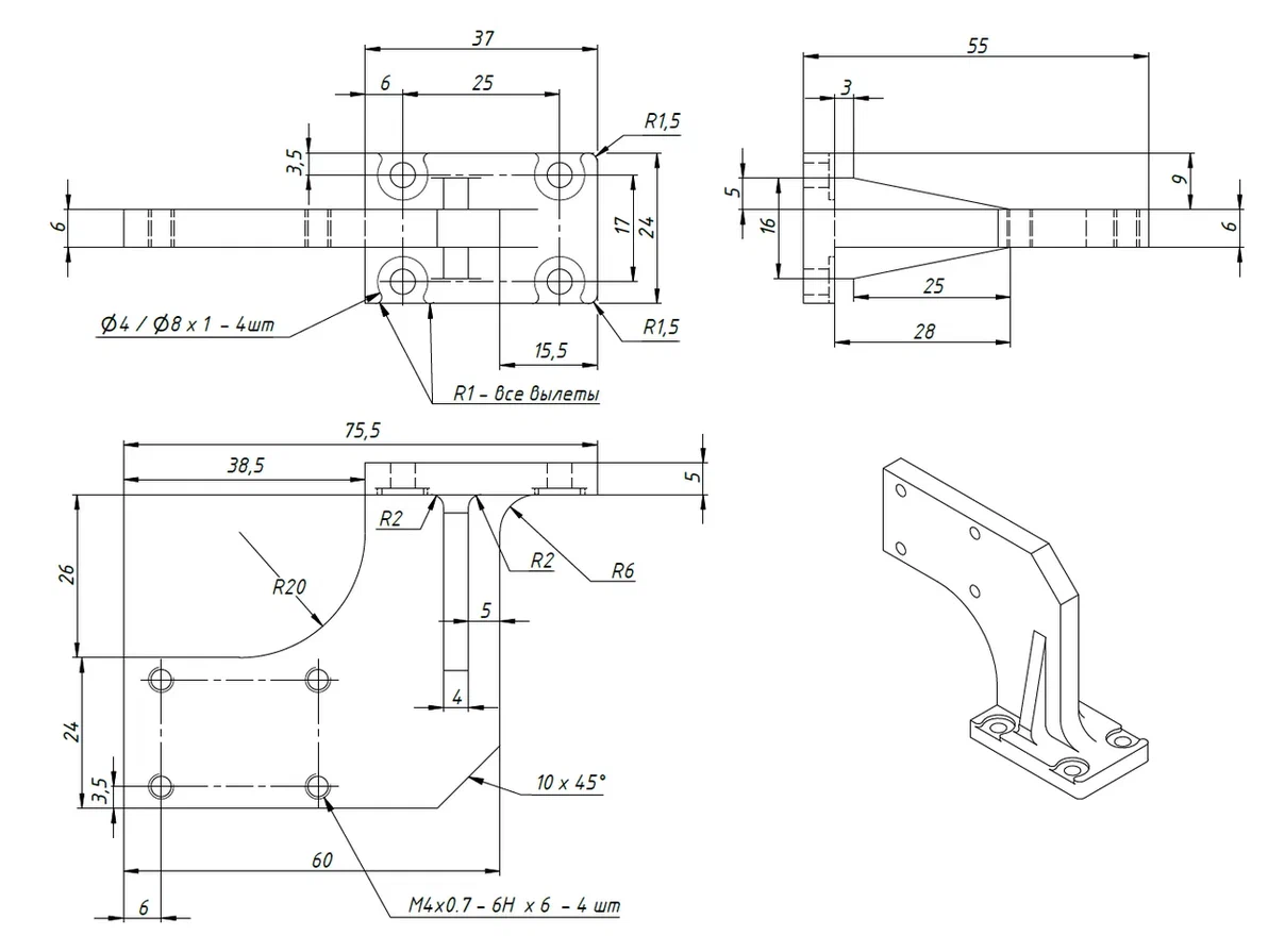 - Сделайте 3D-модель детали согласно чертежу (рис. 1.4), имея ввиду, что размеры указаны в миллиметрах.