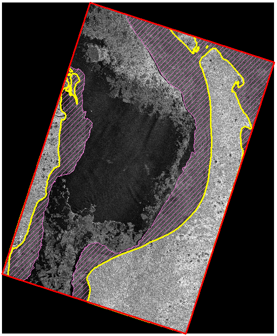 Рис. 1.3. Фрагмент радиолокационного снимка, на котором желтым цветом показана береговая линия, штриховкой — припайПрипай — неподвижный морской лед вдоль берега. На снимках в радиолокационном диапазоне имеет достаточно однородную структуру. Для векторизации границ припая (рис. 1.3) необходимо использовать растр, полученный при согласованной горизонтальной (HH) поляризации электромагнитных волн.