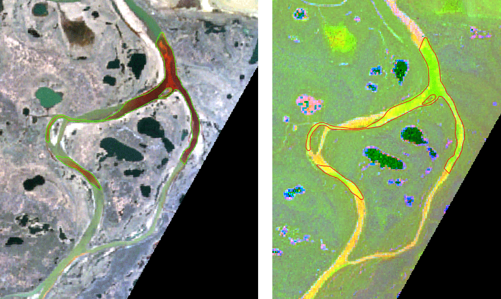 Необходимо выполнить дешифрирование загрязнения реки тяжелой фракцией нефти.