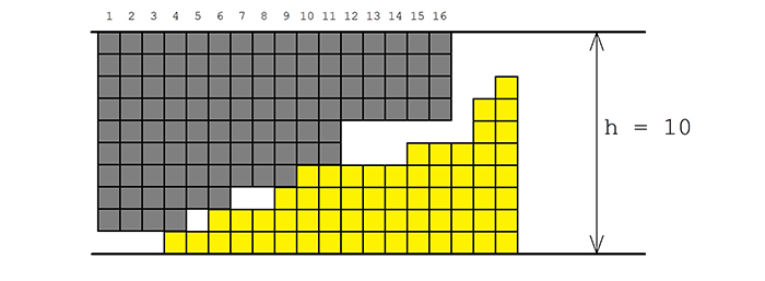 Замок представляет собой конструкцию размера \(h\) единиц в высоту и \(n\) единиц в длину. Внутри замка содержатся \(n\) вертикальных цилиндров, каждый имеет ширину \(1\) и высоту \(a_i\). Эти цилиндры расположены внутри замка в порядке неубывания, то есть \(a_{i - 1} \geqslant a_i\) для всех \(i\) от \(2\) до \(n\). Все \(a_i\) строго меньше высоты замка \(h\). Цилиндры внутри замка закреплены неподвижно.