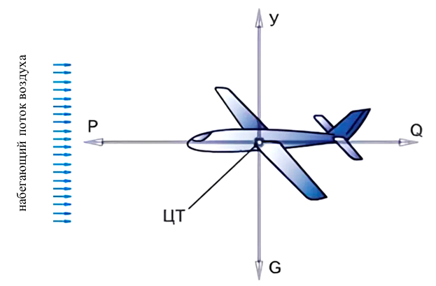 Горизонтальный полет — прямолинейный полет с постоянной скоростью на постоянной высоте. Схема сил, действующих на самолет, показана на рис. 1.1: \(\text{Y}\) — подъемная сила, \(\text{P}\) — тяга самолета, \(\text{Q}\) — сила лобового сопротивления, \(\text{ЦТ}\) — центр тяжести, \(\text{G}\) — сила тяжести.