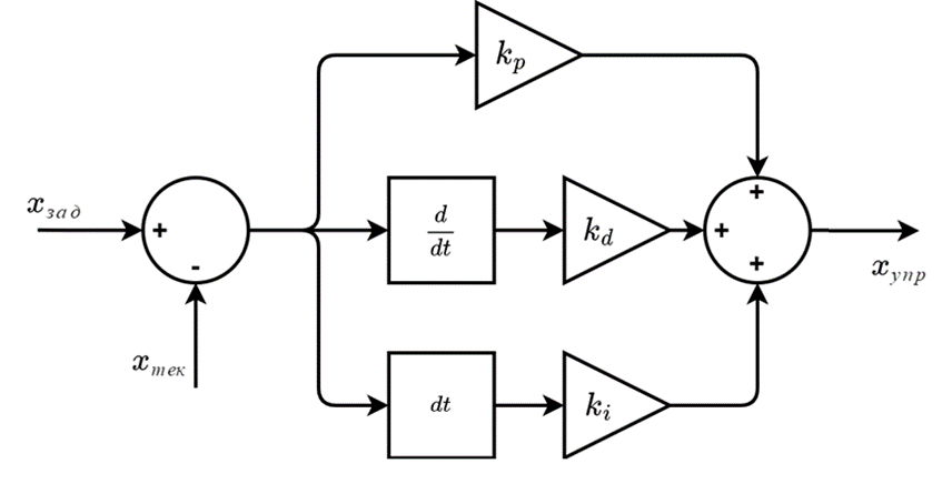 Математическое представление этой структуры имеет вид: \[\delta=x_{\text{зад}}-x_{\text{тек}};\] \[x_{\text{упр}}=k_p \delta+k_i \int_{\square}^{\square} \square \delta dt+k_d \dfrac{d}{dt} \delta.\]