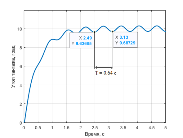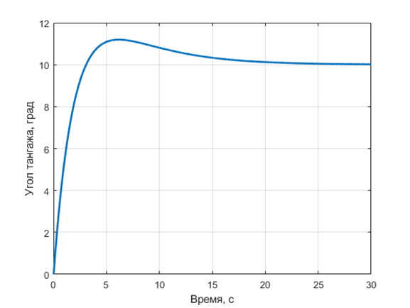 Рассчитайте значения всех трех коэффициентов \(k_p\), \(k_i\), \(k_d\) ПИД-регулятора управления углом тангажа БВС, если при формировании целевого значения угла тангажа \(x_{\text{зад}}=10°\), и значении пропорционального коэффициента \(k_p=1{,}4\) \(1/\text{с}\) был получен следующий отклик системы (переходный процесс) — рис. 1.5.