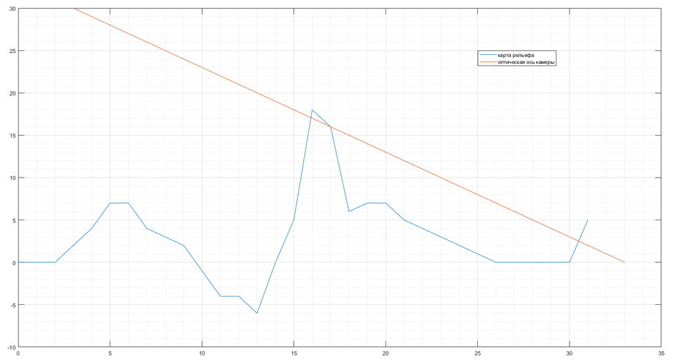 Для определения участка пересечения оптической оси с рельефом в первом приближении воспользуемся графическим методом. Построим график карты высот и линии оптической оси. Так как угол отклонения камеры равен 45°, то оптическую ось можно построить как гипотенузу равнобедренного прямоугольного треугольника, то есть в виде отрезка с двумя точками, положением камеры (3, 30) и точки с нулевой высотой на расстоянии 30 м от положения камеры (33, 0). Полученный график приведен на рис. 1.7.