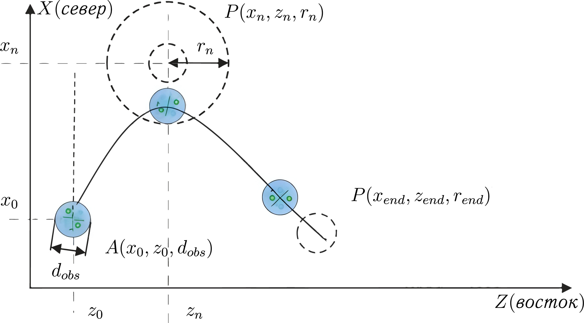 \[R=\frac{V_g^2}{g\cdot \operatorname{tg}(\gamma )}.\] Начальное положение БЛА — \(A(x_0,z_0)=(0{,}0)\) м.
