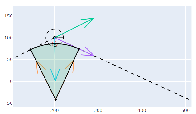 - найти радиус дуги и центр окружности, формирующей эту дугу, для построения траектории при пересечении этой точки;
