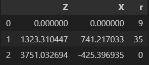 Вторым индексом является КПМ, в столбцах \(Z\) и \(X\) приведены соответствующие координаты, значения которых отличаются в каждом новом тесте, значение столбца с наименованием \(r\) на данном индексе всегда равно нулю ввиду условия задачи.