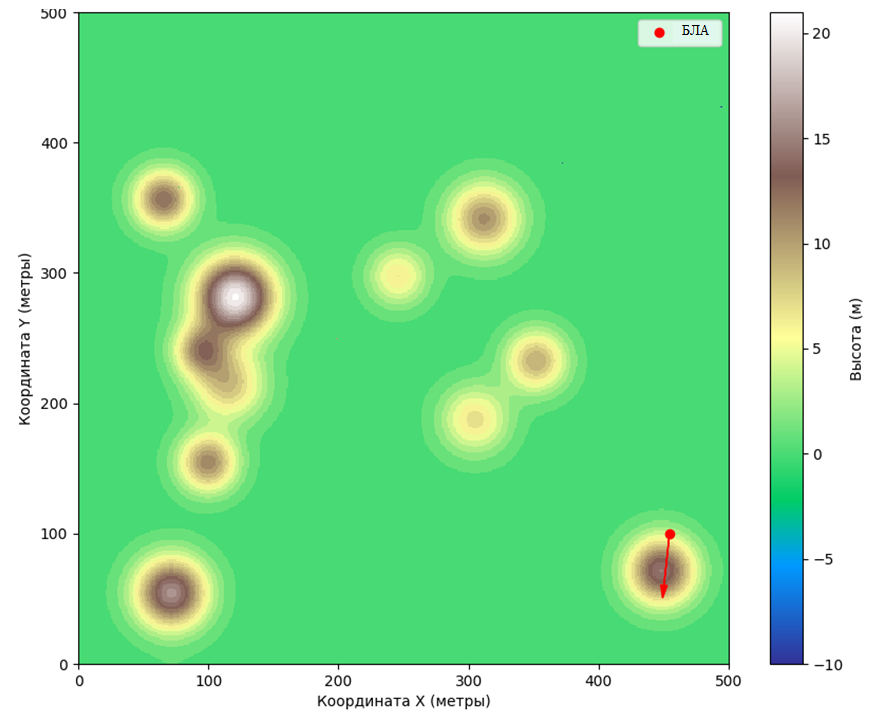 # Координаты БЛА в матрице рельефа