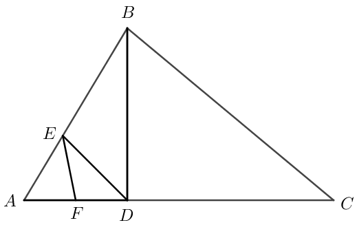 Рассмотрим \(\triangle ABD\). Так как \(DE\) — биссектриса, то \[\frac{AE}{EB} = \frac{AD}{BD} = \frac{7}{5}\cdot \frac{5}{24} = \frac{7}{24}.\] Треугольники \(AED\) и \(ABD\) имеют общую высоту, проведенную из точки \(D\). Следовательно, \[S_{AED} = \frac{AE}{AB}S_{ABD} = \frac{7}{31}\cdot \frac{84}{25}.\]