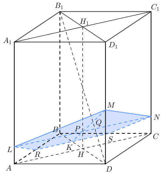 - \(RLMNS\) — искомое сечение: \(MK \subset RLMNS\), \(MK \perp DB_{1}\) по построению, \(LN \subset RLMNS\), \(LN \parallel AC\), \(AC \perp DB_{1}\) по теореме о трех перпендикулярах.