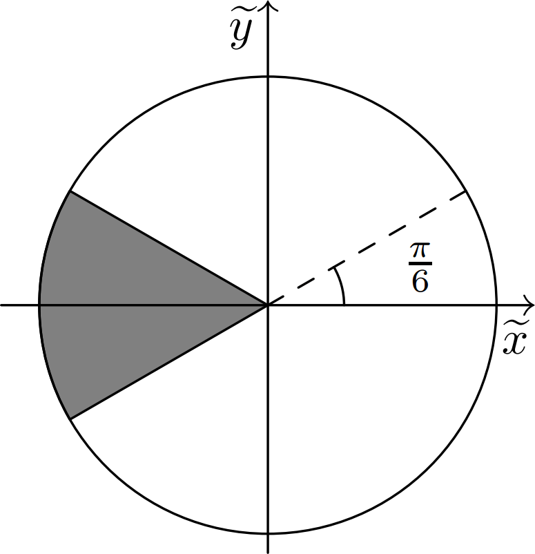 Угол сектора круга при этом равен \(\alpha = 2 \cdot \dfrac{\pi}{6} = \dfrac{\pi}{3}\) радиан (прямая \(\widetilde{y} = \dfrac{1}{\sqrt{3}}\widetilde{x}\) проходит под углом \(\operatorname{arctg} \dfrac{1}{\sqrt{3}} = \dfrac{\pi}{6}\) к оси \(\widetilde{x}\)), а значит, площадь кругового сектора \[S = \frac{1}{2}R^{2} \cdot \alpha = \frac{1}{2} \cdot 6^{2} \cdot \frac{\pi}{3} = 6 \pi.\]
