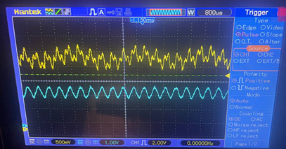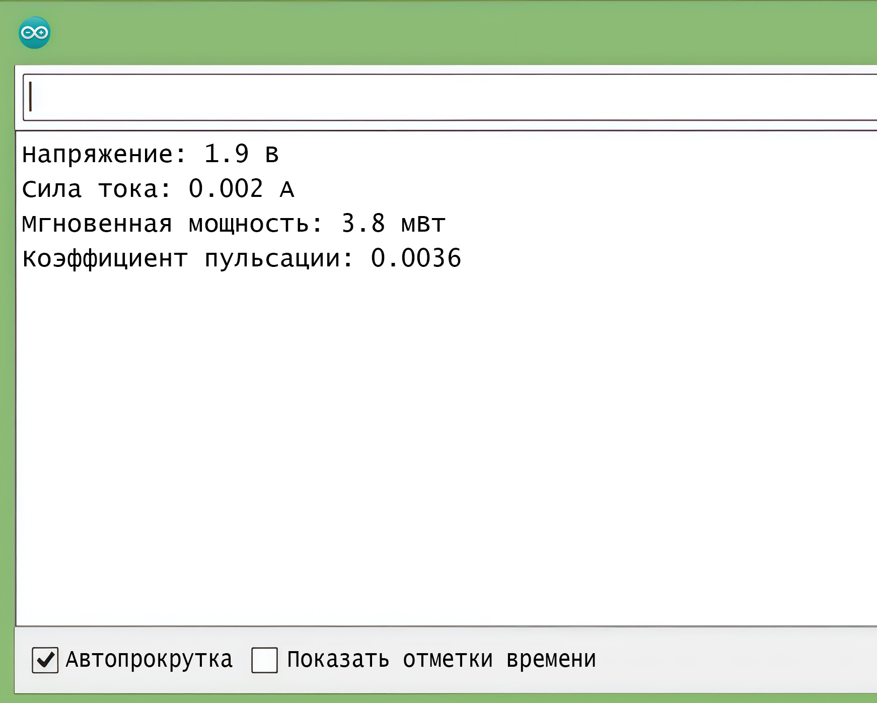 | 7 | Постобработка (анализ сигнала, расчет характеристик сигнала) | 25 | По 5 баллов за критерий: 1. амплитудный спектр суммарного сигнала; 2. амплитудный спектр сигнала после фильтрации; 3. расчет среднего по 10-секундной выборке мгновенного значения тока; 4. расчет среднего по десятисекундной выборке мгновенного значения мощности; 5. расчет коэффициента пульсации. |