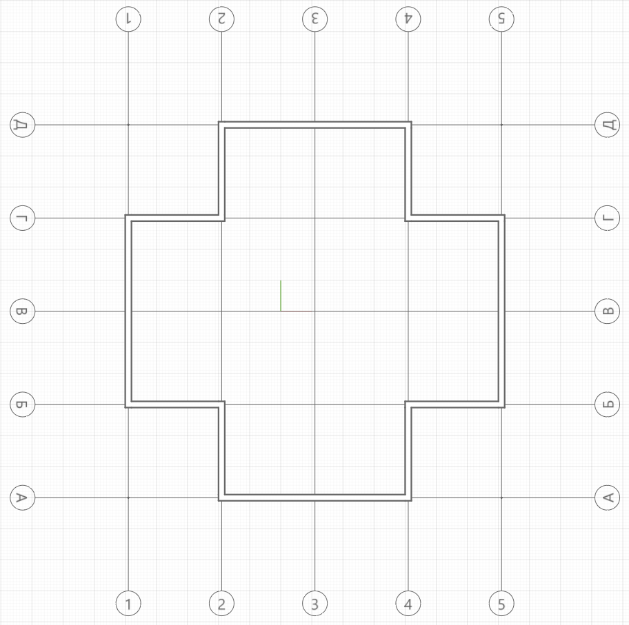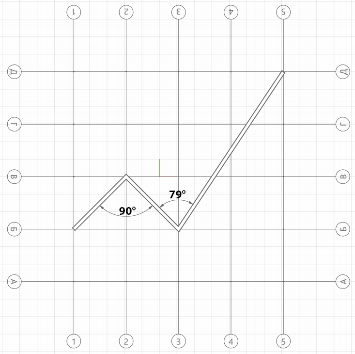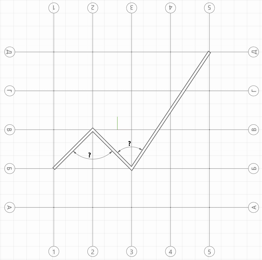 В программе Renga нарисуйте сетку осей по горизонтали от 1 до 5 с шагом 3000 мм и по вертикали от А до Д с шагом 3000 мм. По нарисованной сетке осей создайте стены (толщина стены — 200 мм, привязка по центру), ориентируясь по координатам на рис. 2.2. По выполненным построениям определите размер углов, указанных на рисунке, используя инструмент Угловой размер. Найдите разницу между получившимися углами.