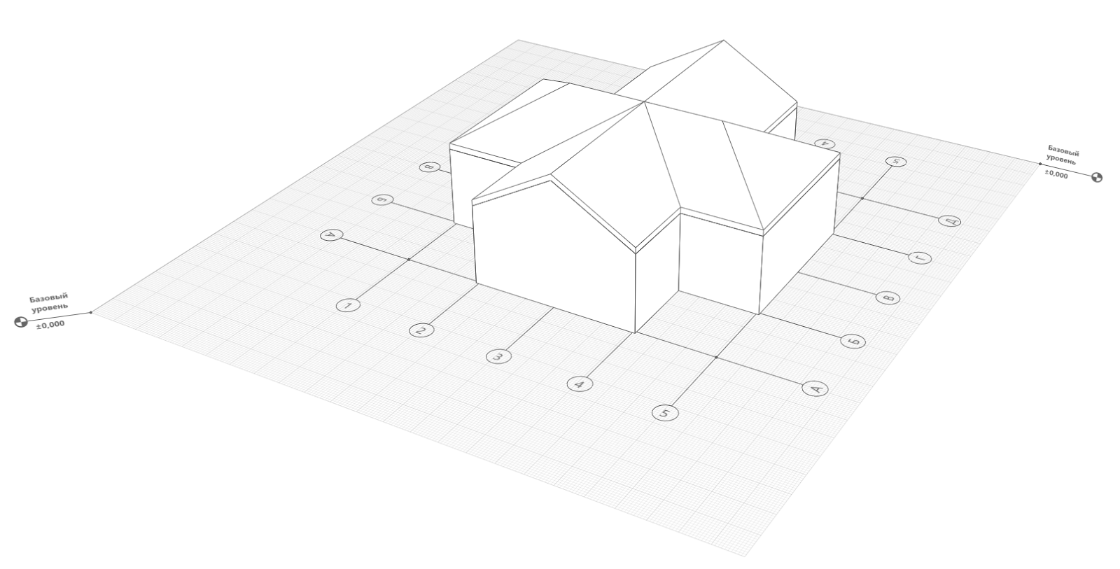 Нарисуйте сетку осей по горизонтали от 1 до 5 с шагом 3000 мм и по вертикали от А до Д с шагом 3000 мм (ориентируйтесь на рис. 2.4). По нарисованной сетке осей создайте стены (толщина стены — 200 мм, привязка по центру), ориентируясь по координатам на рис. 2.4. Затем постройте крышу толщиной 200 мм по уровню на отметке +3000 мм (привязка по внешнему контуру стены), используя способы построения фронтонов (участки по оси А и 2-4, ось Д и 2-4) и скатов, ориентируясь на рис. 2.5. Определите чистый объем получившейся крыши.