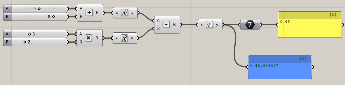 Решите уравнение с помощью компонентов Grasshopper, используя компоненты со вкладки Maths в группах Operators и Polynomials, а также слайдеры.
