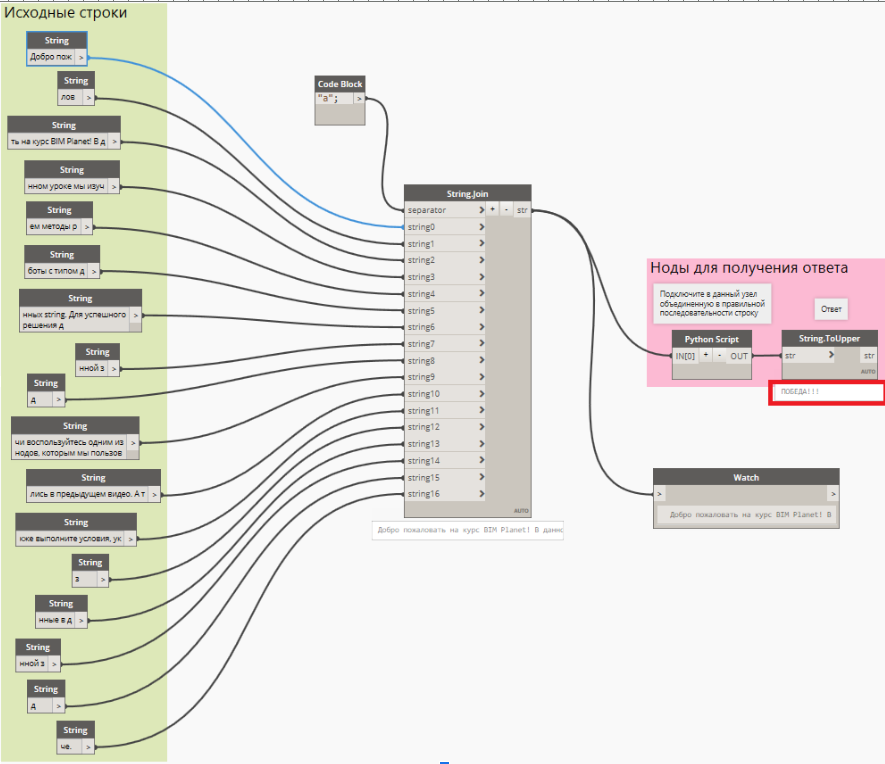 Скачайте и запустите файл скрипта: https://disk.yandex.ru/d/I2t7Onw3o5gvOA. Объедините строки, которые находятся внутри данного скрипта, в одну. При этом нужно использовать соединительный символ маленькой русской буквы а. После объединения должен получиться связный и логичный текст без каких-либо явных ошибок. Для этого необходимо менять ту последовательность, с которой строки объединяются. Полученную строку подключите в ноды для получения ответа.