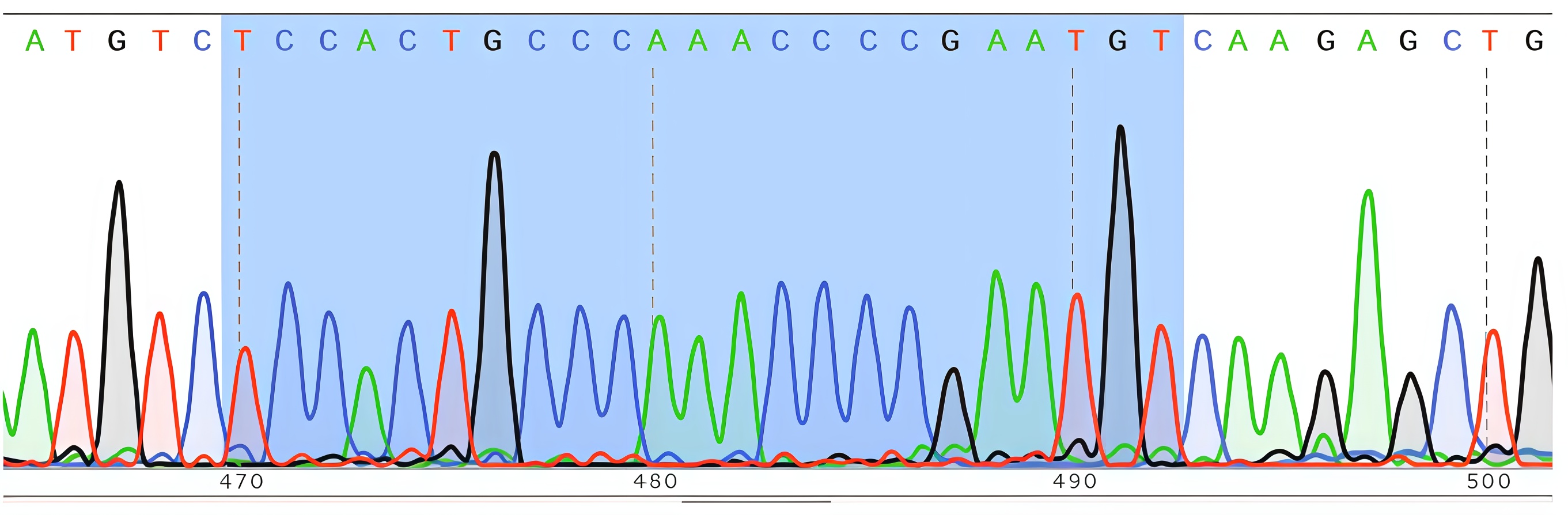 Результаты секвенирования ДНК по Сэнгеру можно представить в виде «секвенограммы», пики которой соответствуют последовательности нуклеотидов в анализирумой молекуле (рис. 1.1).