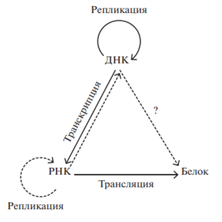 Переход генетической информации последовательно от ДНК к РНК и затем от РНК к белку является универсальным для всех без исключения клеточных организмов, лежит в основе биосинтеза макромолекул. Репликации генома соответствует информационный переход ДНК \(\rightarrow\) ДНК или РНК \(\rightarrow\) РНК.