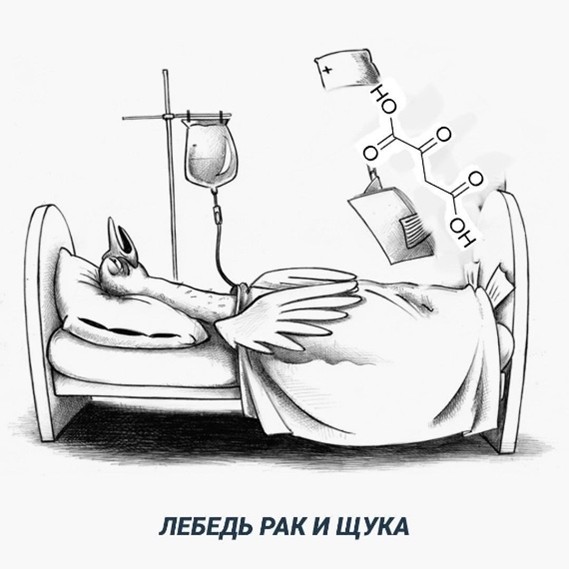 В начале цикла трикарбоновых кислот ацетил-КоА, образованный при распаде глюкозы, жирных кислот или аминокислот, отдает свою ацетильную группу четырехуглеродному соединению — оксалоацетату (щавелевоуксусной кислоте — ЩУКа), при этом образуется шестиуглеродный цитрат. Цитрат затем изомеризуется в изоцитрат, который далее дегидрируется и декарбоксилируется до пятиуглеродной кислоты — \(\alpha\)-кетоглутарата. \(\alpha\)-кетоглутарат вновь декарбоксилируется, превращаясь в четырехуглеродный сукцинат. Сукцинат затем превращается в фумарат под воздействием сукцинатдегидрогиназы, после чего он в два этапа ферментативно преобразуется снова в оксалоацетат — ЩУКу.