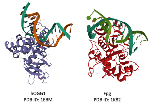 Как известно, для многих ферментов существуют гомологи из других организмов, что характерно и для hOGG1. В клетках E. coli также присутствует система BER, а ДНК-гликозилаза Fpg (DNA-formamidopyrimedine-glycosylase — формамидо-пиримидин-ДНК-гликозилаза) имеет схожую каталитическую активность c hOGG1. В отличие от других гомологичных белков, hOGG1 и Fpg имеют совершенно разные аминокислотные последовательности, а также вторичную и третичную структуру.