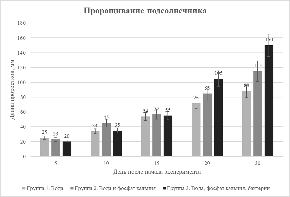 Маша провела эксперимент по проращиванию семян подсолнечника. Для этого она поместила по 100 проросших семян подсолнечника в несколько кювет с войлочными ковриками. Одну из кювет она поливала водой, в другую добавила небольшое количество фосфата кальция, в третью добавила фосфат кальция и один из штаммов бактерии Bacillus megaterium, которую часто добавляют в качестве бактериального удобрения. Далее Маша замеряла длину побегов следующие несколько дней с помощью линейки и заносила результаты в таблицу. По результатам наблюдений ей удалось построить диаграмму, представленную на рис. 1.1. Планки погрешностей отображают доверительный интервал, в котором находится истинное среднее значение длины проростков.
