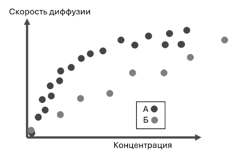 На рисунке приведены графики скорости проникновения двух веществ А и Б. Какой из графиков (А или Б) лучше описывает диффузию для аминокислот? Почему для графика А скорость диффузии при больших концентрациях перестает увеличиваться, а для графика Б продолжает линейно расти?