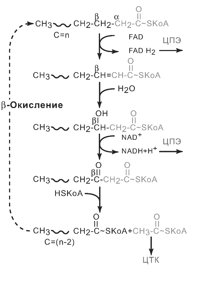 Одной из мишеней гормона Z является бурый жир, который богат многочисленными каплями жира и митохондриями. Жир расщепляется на глицерин и жирные кислоты. Жирные кислоты транспортируются в митохондрии. Жирные кислоты в митохондриях находятся в комплексе с коферментом А (HS-KoA) и подвергаются циклическому \(\beta\)-окислению (см. рис. 2.2). В итоге в каждом цикле отщепляется двухуглеродный фрагмент ацетил-кофермент А (\(\ce{CH3-CO-SKoA}\)), который в цикле трикарбоновых кислот (ЦТК, цикл Кребса) дает 3 молекулы NADH, 1 молекулу FADH\(_2\) и 1 молекулу АТФ. Рассчитайте, какое количество NADH, FADH\(_2\) и АТФ образуется из молекулы стеарил-КоА (\(\ce{C17H35CO-SKoA}\)) в ходе протекания циклов \(\beta\)-окисления и цикла трикарбоновых кислот (ЦТК, цикл Кребса).