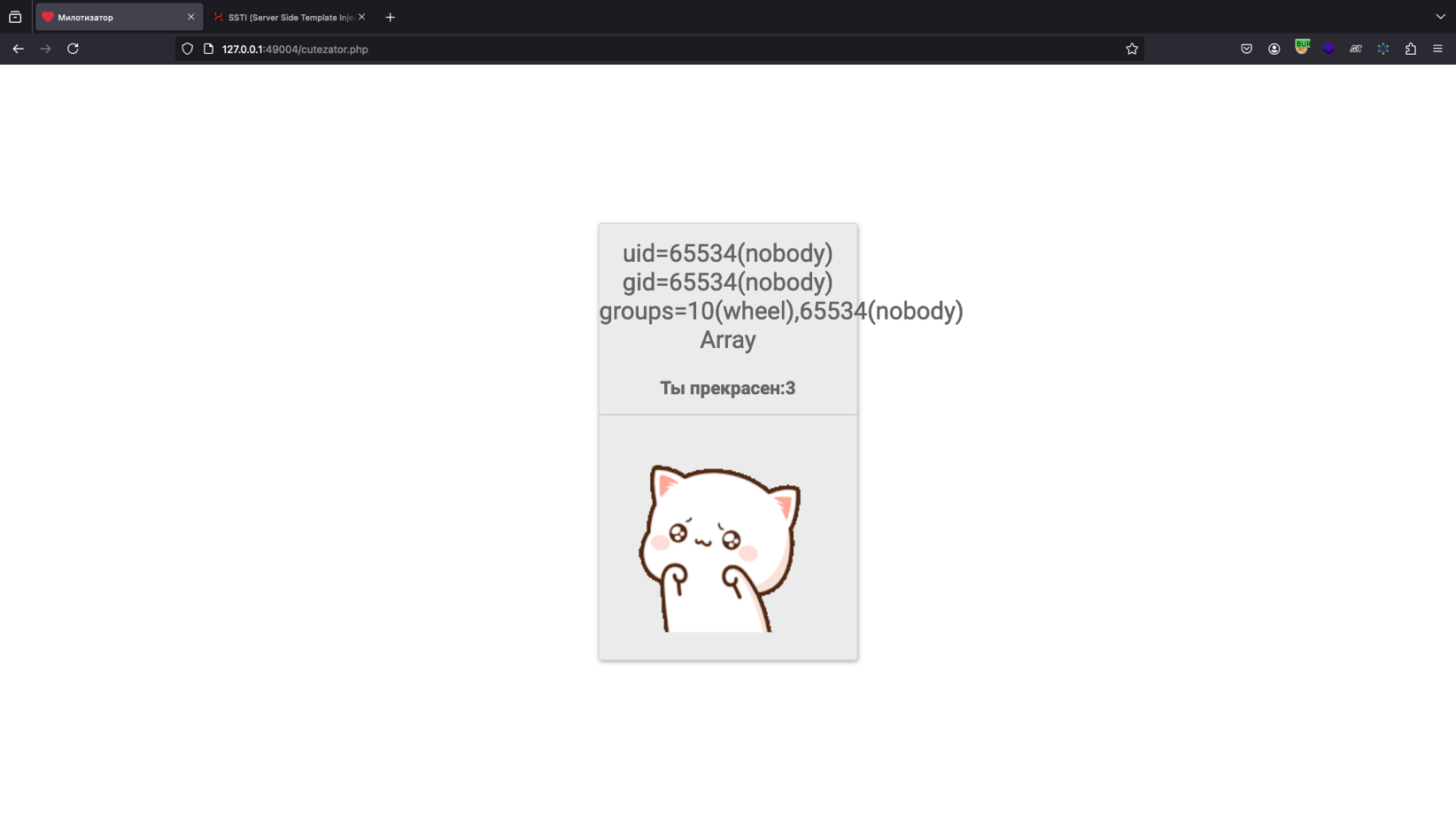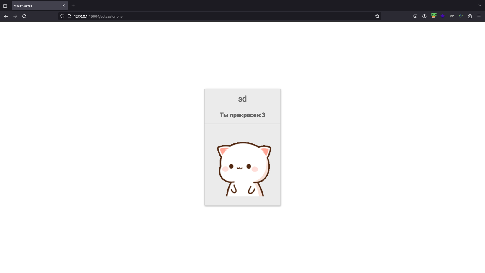 POST-запрос по маршруту/cutezator.php, в ответ на который вернется страничка, содержащая наш ввод + милый комплимент :3.Рис. 1.10.Далее следует проэксплуатировать