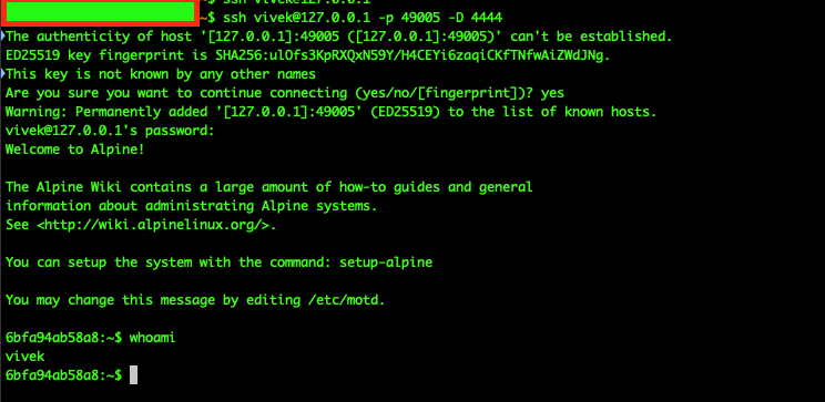 SSHк контейнеру с таском через пользователяvivek, и теперь локальный порт, в случае на рис. 1.24 \(4444\), будет прокидывать весь трафик черезSSH.Рис. 1.24.Немного изменяем файл с конфигурацией