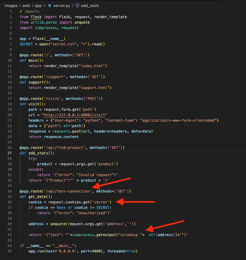 server.pyможно увидеть маршрут/api/test-connection, принимающийGET-параметрaddress, чье значение попадает в функциюsubprocess.getoutput(). Данная функция может использоваться для эксплуатацииRCE. Однако в 37-й строчке можно увидеть проверку на наличие специальногоcookie:secret, значение которого неизвестно, из-за чего самостоятельно проэксплуатироватьRCEнельзя.Рис. 1.42.В файле