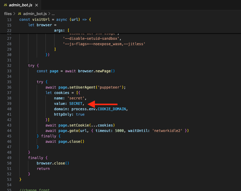 admin_bot.js, который отвечает за работу бота, можно увидеть на 39-й строчке, что боту выдается как раз этаcookie secret.Рис. 1.43.Однако у