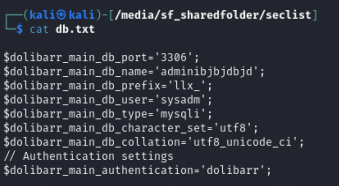 В файле db.txt находится часть конфигурационного файла mysql, в котором можем обнаружить имя одного из пользователей целевой системы — sysadm.