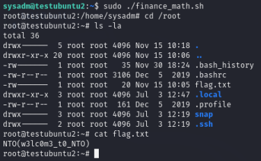 Так как пользователь может редактировать файл finance_math.sh, то добавляем строчку /bin/bash в скрипт и запускаем этот скрипт в привилегированном режиме, после читаем флаг в /root.