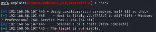 С помощью инструментария msfconsole и модуля windows/smb/ms17_010_ eternalblue проверяем наличие уязвимости MS17-010.