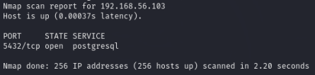 С помощью инструмента nmap сканируем узел, видим открытый \(5432\) порт — база данных postgresql.